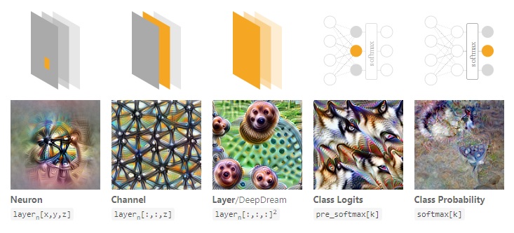 Examples of what different parts of neural networks learn, from the wonderful series on feature visualisation by Chris Olah and team.