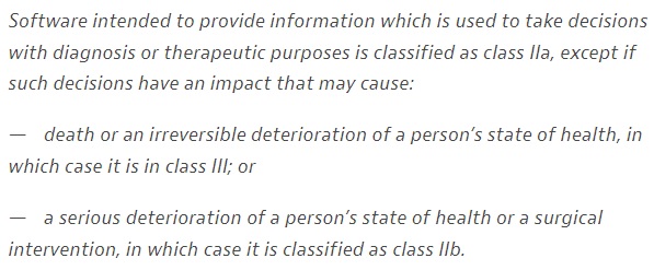 This is clearly what the EU regulators thought too, since they put the Oxipit system into class IIb and not IIa, implying they see the system to be making decisions about risky things. I admit to having serious ongoing reservations though. The MDR guidance in the EU states the following: