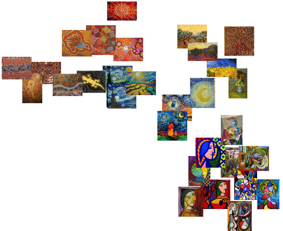 One example of an image space (projected in 2d) where distance from the centre reflects, it seems, brush stroke type (dot to continuous) and colour (reds and ochres to blues and greens).